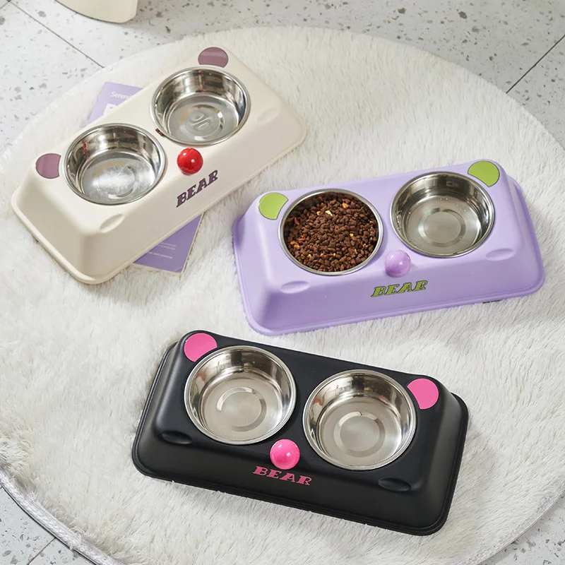 Factory Direct Raised Anti-slip Non-spill Stainless Steel Pet Cat Dog Food and Water Feeding Double Bowls with Resin tray